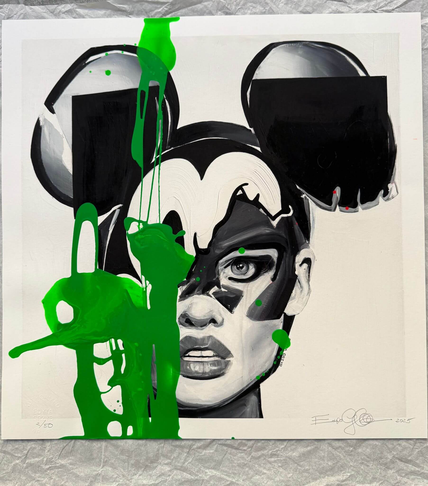 Each print is made on high-quality paper and partially hand-painted by the artist. The base print remains black and white, while the colorful accents are added manually, making each artwork unique. Additionally, each piece is numbered and signed on the front margin.