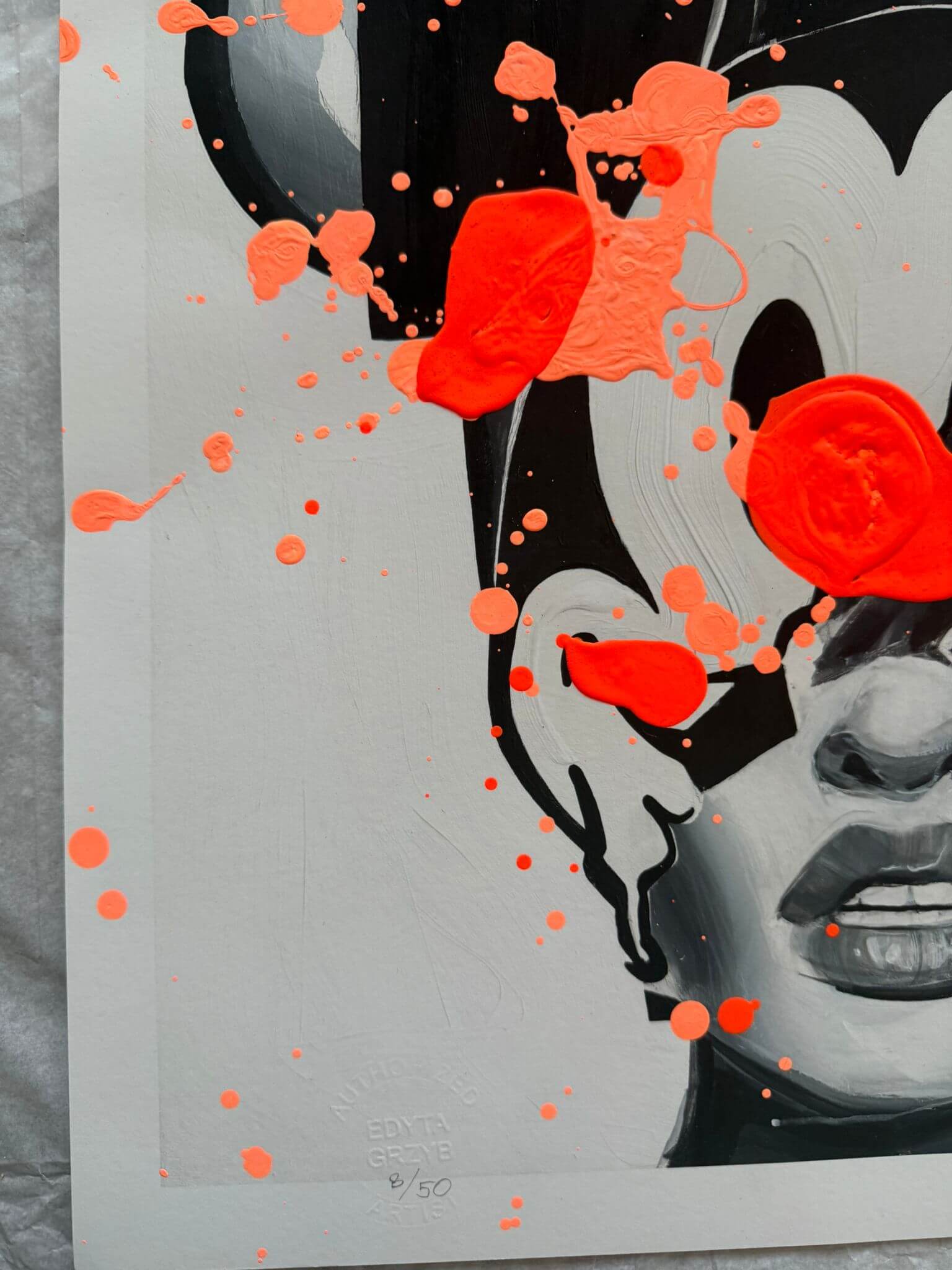 Jeder Druck wird auf hochwertigem Papier gefertigt und teilweise von der Künstlerin von Hand mit Farben bemalt. Der Grunddruck bleibt schwarz-weiß, während die farbigen Akzente manuell hinzugefügt werden, wodurch jedes Kunstwerk einzigartig wird. Zudem ist jedes Exemplar nummeriert und auf dem vorderen Rand signiert.