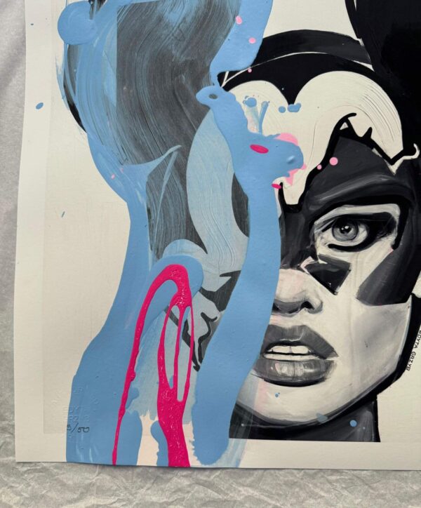 Jeder Druck wird auf hochwertigem Papier gefertigt und teilweise von der Künstlerin von Hand mit Farben bemalt. Der Grunddruck bleibt schwarz-weiß, während die farbigen Akzente manuell hinzugefügt werden, wodurch jedes Kunstwerk einzigartig wird. Zudem ist jedes Exemplar nummeriert und auf dem vorderen Rand signiert.